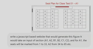 I literally wrote a prompt in ChatGPT (model o3) with this prompt “write a javascript based website that would generate this figure It would take an input of section (A1, A2, B1, B2, C1, C2), and for A1, the seats will be marked from 1 to 33, A2 from 34 to 65 etc.”